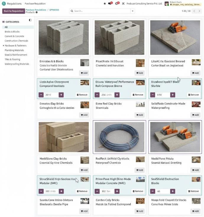 To solve this, we’ve introduced a fully integrated Visual Product Catalog inside the Material Requisition workflow of Odoo.
